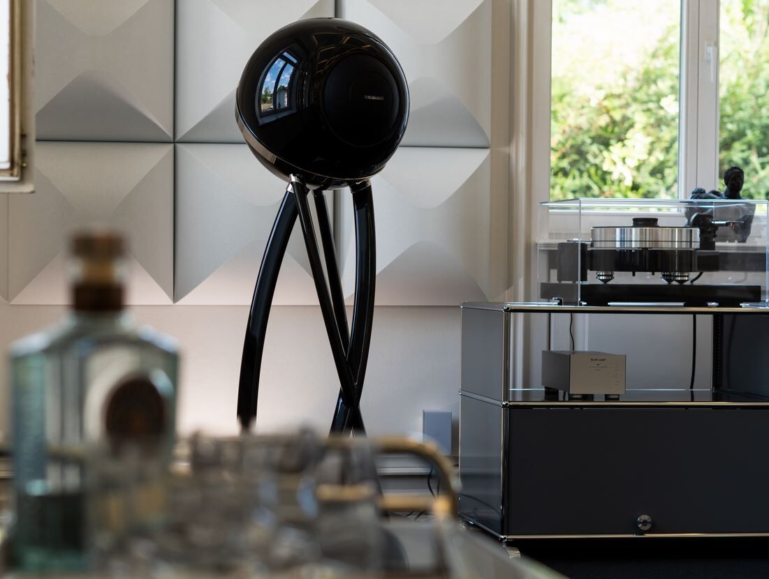 Exklusive Materialien und ein luxuriöses Finish zeichnen die Pearl Pelegrina ebenso aus wie das ultimative akustische Erlebnis, das sie ermöglichen. Das außergewöhnliche französische Design dominiert trotz seiner Höhe von fast 130 Zentimetern den Wohnraum optisch nicht. Das speziell angefertigte Band aus poliertem Metall um den Kugelkörper wirkt als eleganter Blickfang und betont die vielen weiteren Details und die glänzende Oberfläche der Pearl Pelegrina.