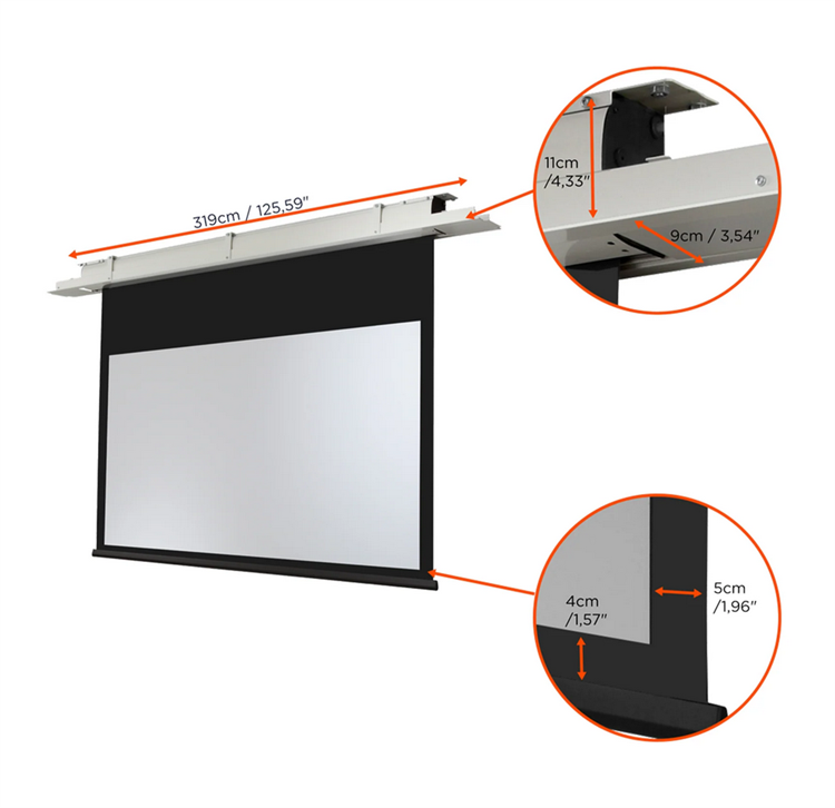 Der Deckeneinbau ist denkbar einfach. Auch nach erfolgter Installation bleibt die Leinwand durch die seitlichen Montage-Klappen jederzeit zugänglich. Der Deckeneinbau ist flexibel zwischen 13,7 und 110 cm Deckenhöhe zur Montagedecke möglich. Der Einbaurahmen schließt perfekt mit der Leinwand und der Zwischendecke ab. Somit ist eine unauffällige Integration der Leinwand gegeben.