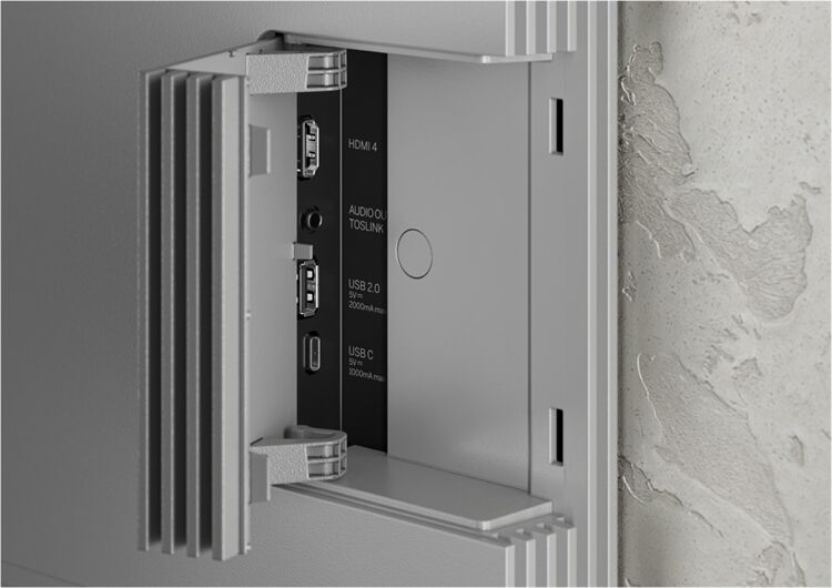 Alle Anschlüsse sind verdeckt, alle Kabel durch das integrierte Kabelmanagement plus Cover in der hell- oder dunkelgrauen Rückwand geführt und versteckt. Solide VESA-Dome erlauben eine Wandmontage.