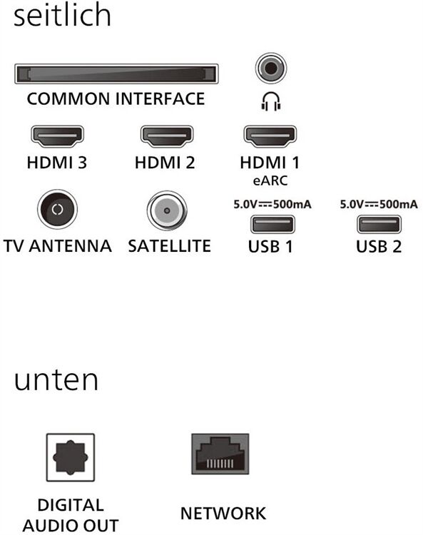 - DVB-T2/-C/-S2 Triple Tuner, 3x HDMI (eARC auf HDMI 1), HDMI 2.1, 2x USB, CI+, Digitaler Audio-Ausgang (optisch), LAN, WLAN 802.11ac (2x2 Dualband) & Bluetooth 5.2 integriert