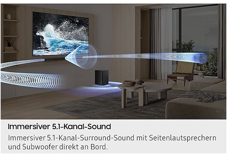 Das 5.1-Surround-Sound-System mit integrierten Seitenlautsprechern und externem Subwoofer, der den Bass-Boost-Modus unterstützt, lässt dich akustisch tiefin jede Szene eintauchen.
