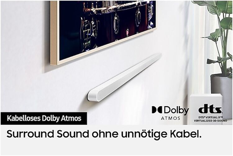 Samsung Soundbars unterstützen die objektbasierte Audiotechnologie Dolby Atmos® kabellos, d. h., ohne dass ein Kabel oder zusätzlicher Dongle angeschlossen werden muss. Erlebe somit beeindruckenden Surround Sound von Filmen und Musik ganz einfach über dein WLAN und freu dich über den aufgeräumten Look in deinem Heimkino.