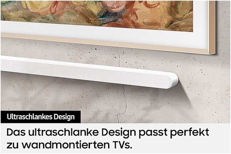 Dank ihres ultraschlanken Designs fügt sich die Samsung Ultra Slim S-Soundbar HW-S711GD nahtlos in den Raum ein und beeinträchtigt, angebracht an der Wand, nicht im Geringsten die Ästhetik deines Heimkinos. Sie passt optimal zu deinem schlanken TV und blockiert durch ihre Größe weder das Bild noch die Bedienung des TVs, wenn diese zusammen auf einem Sideboard aufgestellt werden.