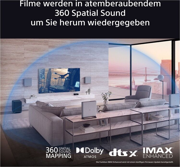 Bravia Theatre Quad bietet das ultimative Surround-Sound-Erlebnis, denn Sonys 360 Spatial Sound Mapping-Technologie erzeugt Phantom-Lautsprecher im ganzen Raum, sodass das Gefühl entsteht, mitten im Geschehen zu sein. Dolby Atmos und DTS:X sind zwei Technologien, die direkt aus dem Kino ins Wohnzimmer kommen. Auch die IMAX Enhanced-Zertifizierung * sorgt für ein authentisches Kinoerlebnis im eigenen Zuhause.